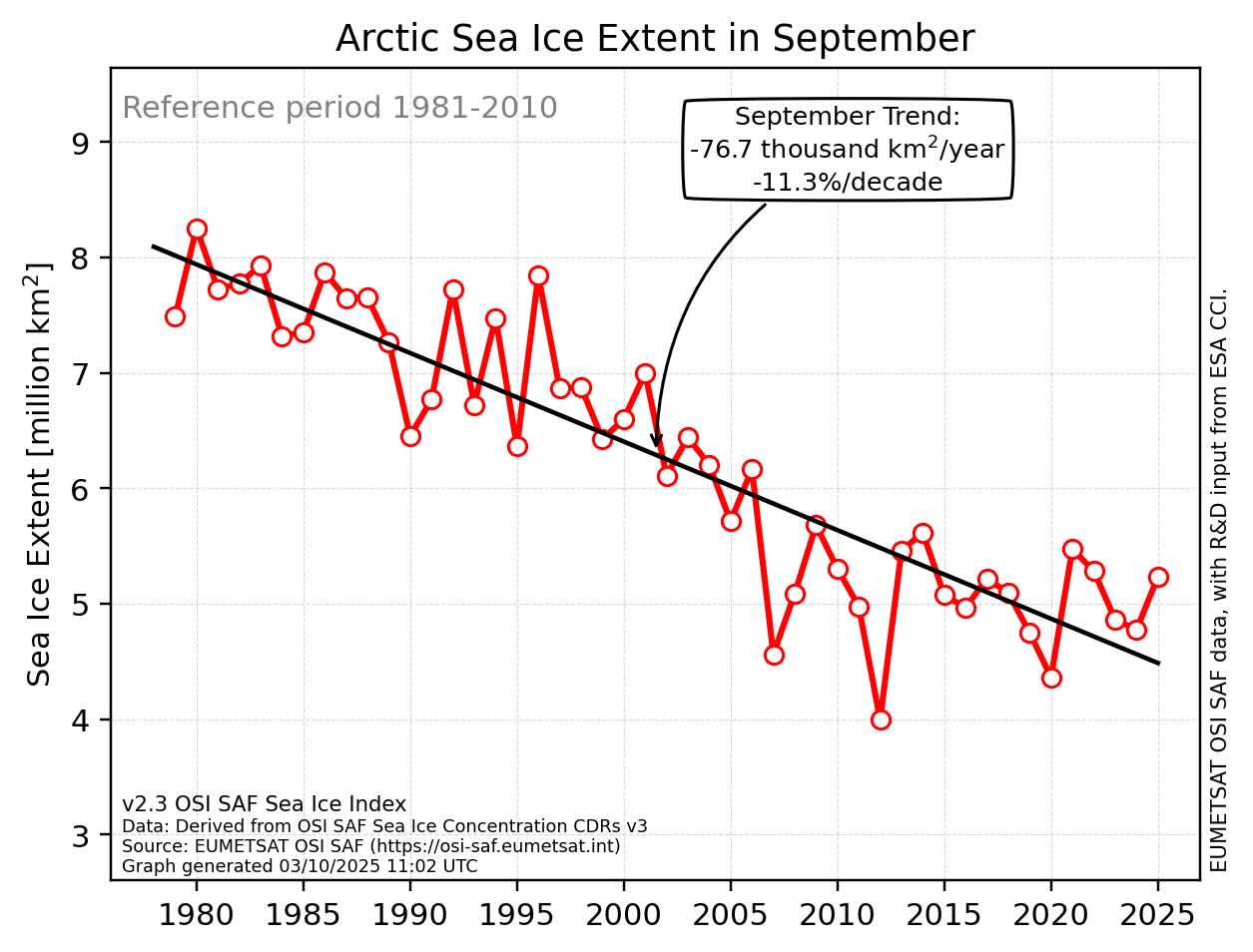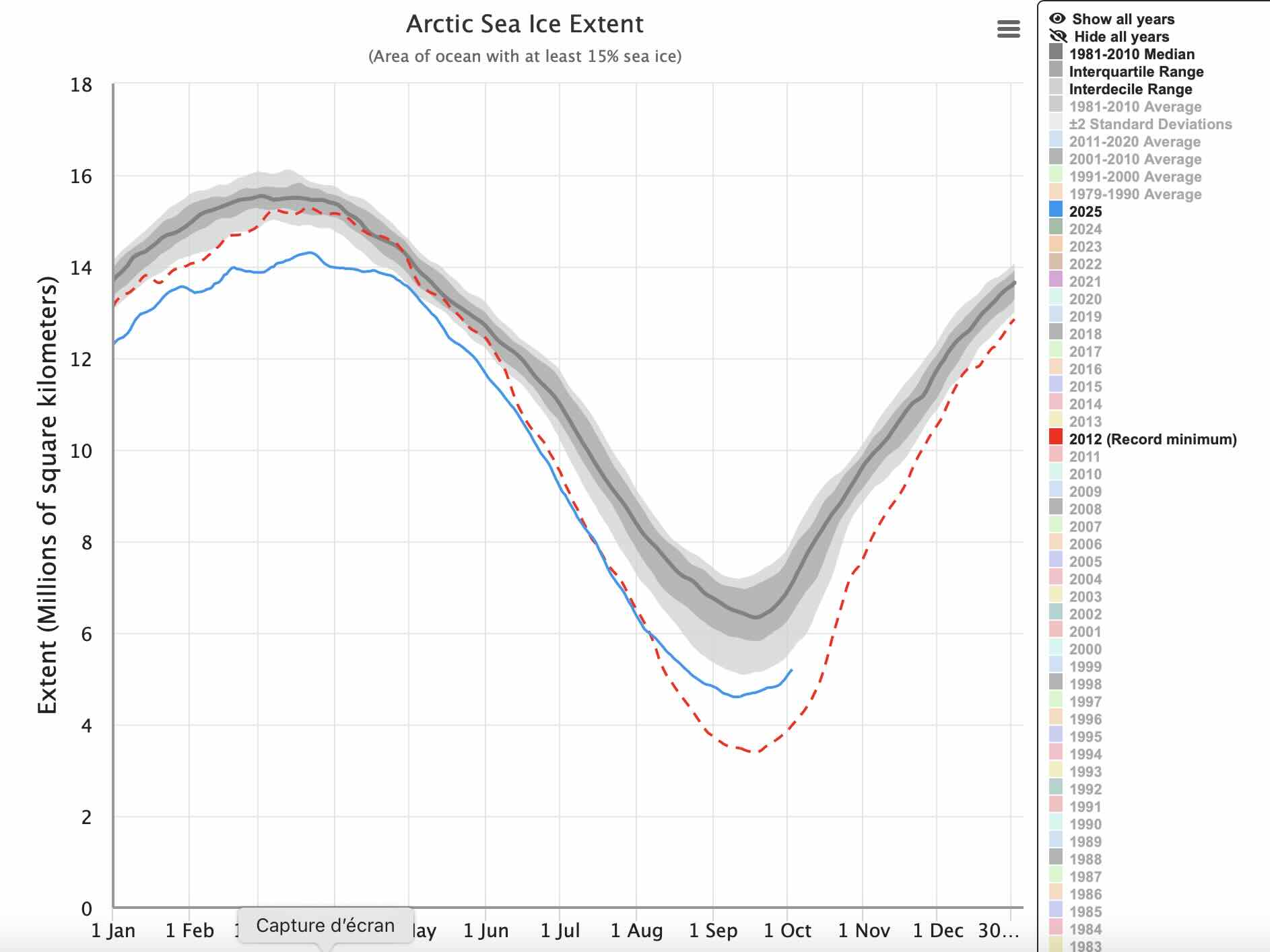 L’extension de la glace arctique du mois de septembre 2025 est plus élevée que celle des mois de septembre des deux dernières années.