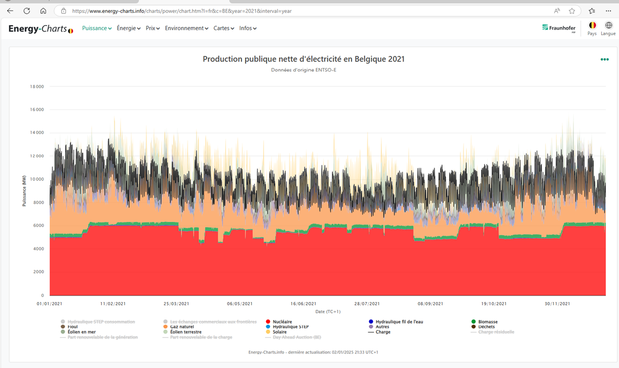 Figure 1. Le mix électrique Belge en 2021 avec encore 6 GW nucléaires en service en rouge (réf.1)
