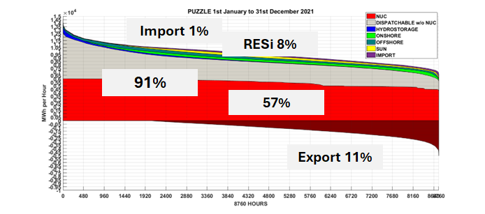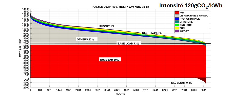 Figure 5. Simulation pour l’année 2021. On prend 40% de la production EnRi de 2021 et une production de base à 7 GW pour un total de 61 TWh/an, assurée pour la plus grande part avec des capacités nucléaires de 7 GW fonctionnant avec un facteur de charge à 95%) (réf.2).