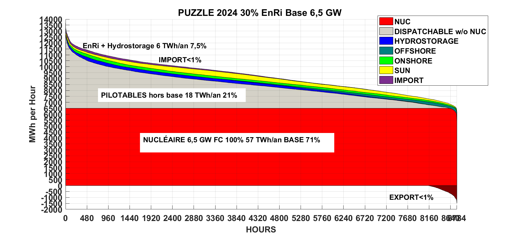 Figure 6. Simulation pour l’année 2024. On prend 30% des productions intermittentes de l’année 2024 et 6,5 GW fonctionnant à 100% pour couvrir entièrement la consommation de base de 57 TWh/an. Les importations et les exportations passent toutes deux en dessous de 1%.