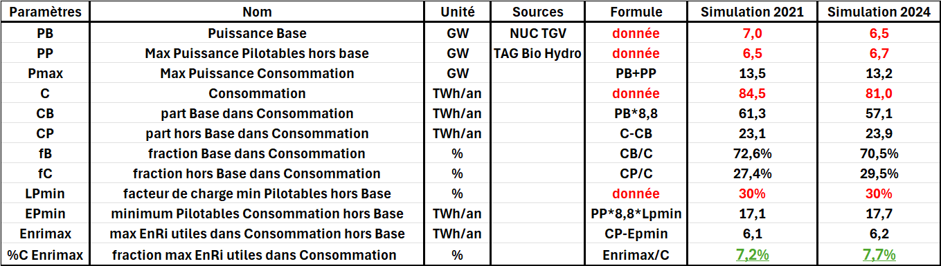 A l’aide d’un tableur, on peut évaluer rapidement le maximum utile de la production intermittente, pour un cas plus général. On entre les données en rouge pour recalculer le maximum utile de kWh dans le mix. Ce maximum garantit que les importations et exportations soient proches de zéro, et que les capacités pilotables des deux parties de la consommation – base et pointe, de natures différentes – peuvent produire sans être éloignées de leurs conditions de fonctionnement optimales. Le calcul est fait dans cette figure pour les données électriques en Belgique en 2021 et 2024.