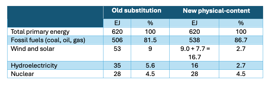 The pattern is consistent: the proportion of non-combustible renewables is roughly halved, while the proportion of fossil fuels increases by several percentage points purely due to the accounting change. The most striking result for non-specialists is the apparent increase in fossil fuels’ share of primary energy.